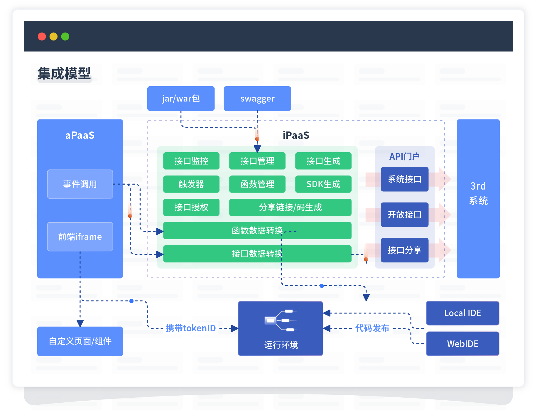 集成模型包括平台本身前、、、、、、、、、、、后端能力的扩展,,,,,,,,也支持通过API门户和第三方系统进行交互。。。。。。。。。。