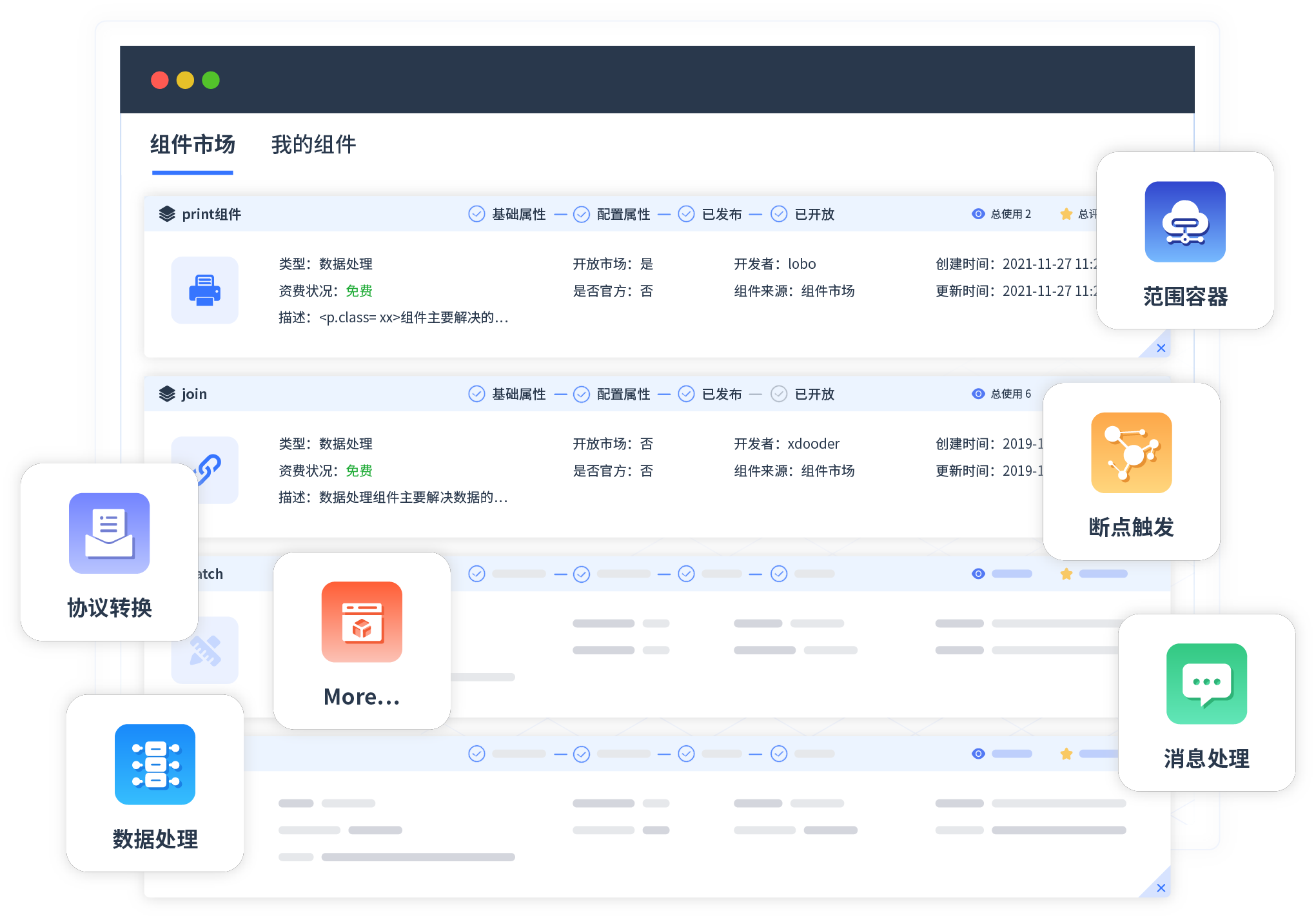 针对集成场景,,,,,EBPAY提供组件市场,,,,,,,,,,,,例如协议转换、、、、、、、、、、、、消息处理、、、、、、、、、、文件操作等。。。。。。。。除平台提供的组件外,,,,,,,,,客户可以自定义所需组件。。。。。。。。。。。。。