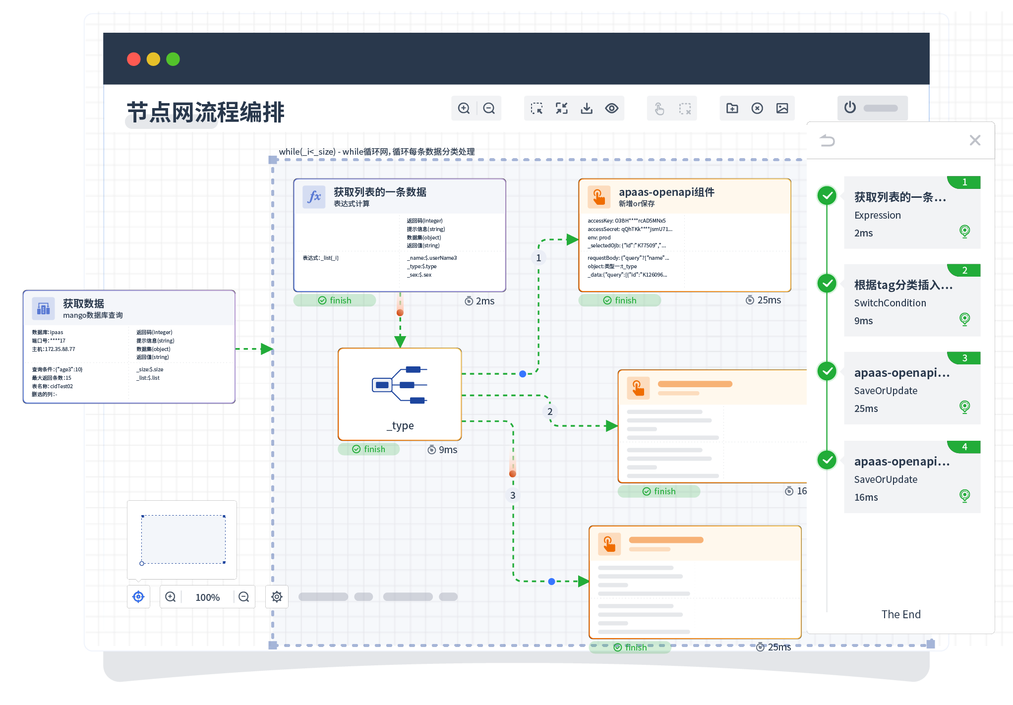 针对集成场景,,,,,,组件定义后支持进行流程编制,,,,,,,,,,不同于传统代码方式,,,,,,通过图形化展示,,,,,,,,,,,支持在线调试、、、、、、、日志查看和运行回放。。。。。。。。。