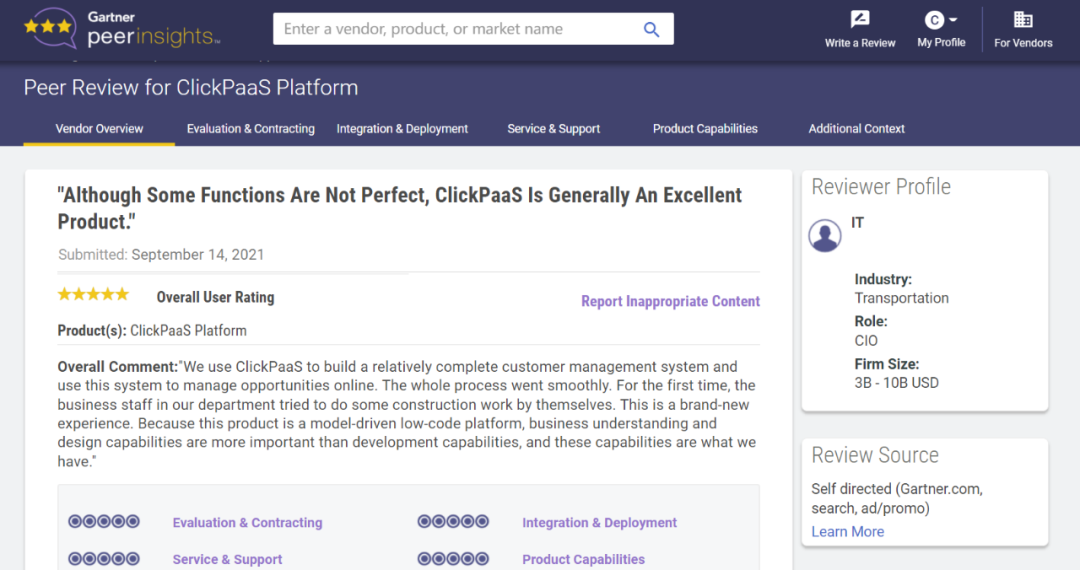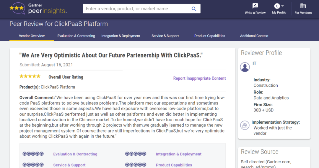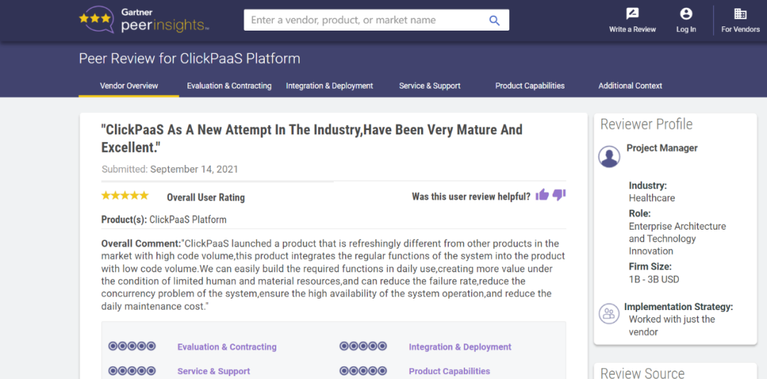 Tips:::::::::::【Peer Insights】——用户对企业IT产品和服务发布真实评价的平台。。。。。。。。。。。。。目前已有355个市场,,,,,,,,255,000条经过验证的评价。。。。。。。。。。。。每一条评价Gartner会针对参评企业营收规模及参评人员信息做验证、、、、评价内容做多维核实。。。。。。。。。。